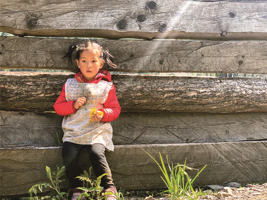 女人們相約去后山林中撿野生菌。一位穿氆氌袍子的老牧人領(lǐng)著小孫女,還有一只勇猛地藏獒,在石屋后方的草坪上等太陽。微風(fēng)輕拂著他們腳邊盛開的鳶尾花,細(xì)聽,那鈴鐺般的花朵搖響嘶嘶桑桑的音樂。小女孩在花叢中那條伸向牧場的小路上撿拾白色的小石子,裝入衣包里,鼓脹后就取出一枚枚投向花叢中的黑蝴蝶,令它的世界撲朔迷離。老牧人瞇縫著眼睛,翻轉(zhuǎn)粗糙的手心手背,仿佛要使它也開出鳶尾花朵來。我朝他們走去,小女孩朝我跑來,撲進我的懷中喊我阿尺。我撫摸她頭頂上的卷發(fā),像撫摸著一只乖覺的小鹿。