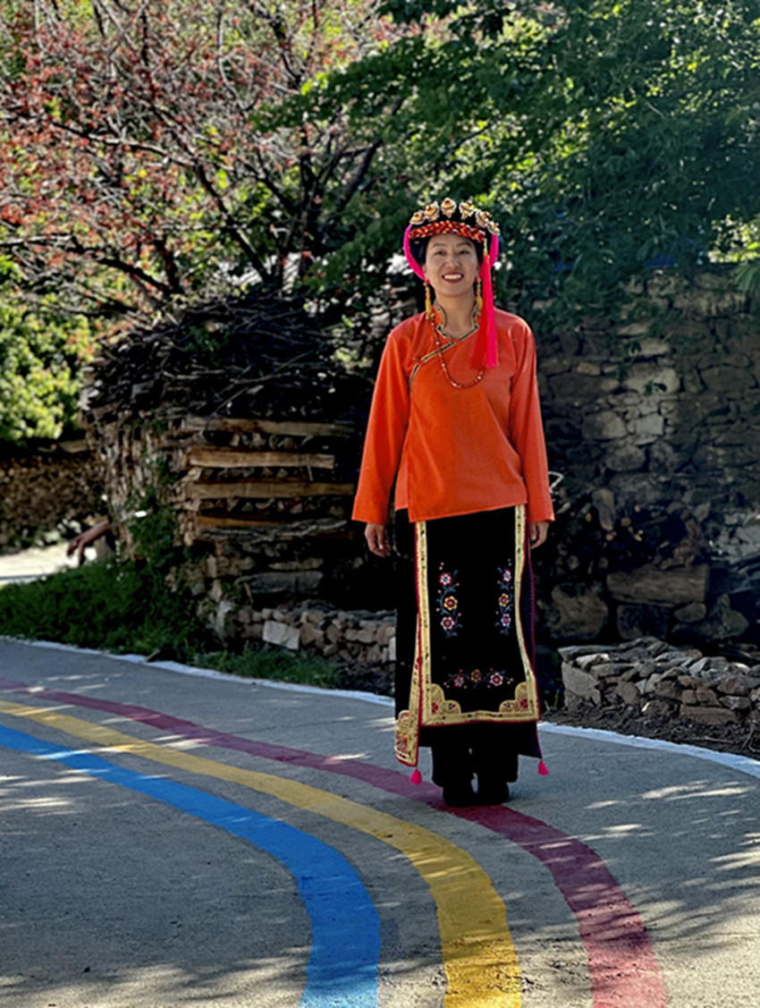 彩色鋪裝的通村路兩邊,成片的苞谷林正在背紅纓,風中響著緊密結實的聲音。各種果木枝繁葉茂,結滿了寶石般紅紅綠綠的果子。一排柴垛上方,伸出很大一片橙色的小果子,沒有葉子,我們像賞花一樣欣喜于它的紅艷。嘉絨姑娘悄默地走在我們身邊,她的手里擺弄著一片草葉,安靜而美好,是感到這一路上的莊稼果木已經足夠繁盛。