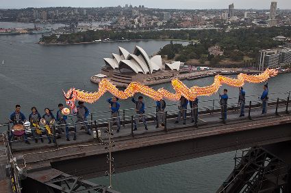 當(dāng)日,由當(dāng)?shù)厝A人團(tuán)體精心準(zhǔn)備的中國傳統(tǒng)舞龍亮相悉尼海港大橋,拉開中國新年慶祝活動(dòng)的序幕。