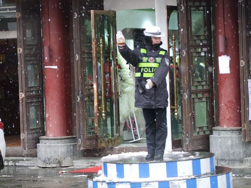 康定秋意正濃,河岸的楊柳還未泛黃,卻意外地迎來了一場不期而遇的降雪,也是今冬康定迎來的第一場雪。大片的雪花輕盈落下,康定城和跑馬山一片銀裝素裹,分外妖嬈。13日早上,康定城依然下著鵝毛大雪。這場深足30厘米的雪,使入冬以來一直持續(xù)的干燥空氣變得濕潤,雪景美不勝收,但也給人們出行帶來許多不便。記者在街道上看到車流量和行人明顯減少,機動車都放慢了速度,以確保行車安全。上學的學生,上班的人群都都裹上了厚厚的冬裝,小心翼翼地行走在雪地上。交警依然堅守在紛飛的風雪中指揮交通;環(huán)衛(wèi)工人和一些單位職工迎著大雪清掃馬路和庭院積雪。記者提醒司機,雨雪天氣謹防交通事故,行人要注意因雨雪路面濕滑,謹防摔傷。