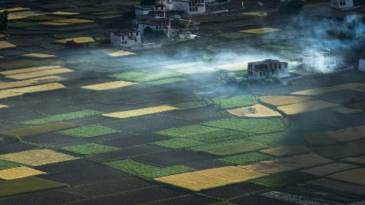 清晨,瓦藍(lán)瓦藍(lán)的天空云霧繚繞,周圍的景物一片朦朧,就好像童話里的仙境,一會兒,太陽從東邊冉冉升起,霧也漸漸消失,村子里屋頂上飄著裊裊煨桑的煙子,我站在山岡上從高處向下俯望,只見高山峽谷之中,層層翠綠的梯田簇?fù)碇l(xiāng)城特有的白藏房,山下的田野,就像一片金色的海洋,將秀麗的田園裝扮得更加如詩如畫。一陣晨風(fēng)吹過,麥田上蕩起了一道道金色的波紋,遠(yuǎn)處傳來了畫眉鳥的歌聲,我被眼前的一切迷住了,仿佛一切都靜止了,她讓我的夢從這里開始。