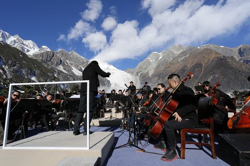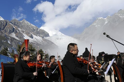 四號(hào)營(yíng)地,晴空萬(wàn)里、風(fēng)和日麗,清澈的高原天空藍(lán)得澄明醉人,來(lái)自四川交響樂(lè)團(tuán)和民間的200多位樂(lè)手共同在海拔3500米的冰川瀑布之下演奏了《青藏高原》、《向往神鷹》、《菊花臺(tái)》等歌曲。