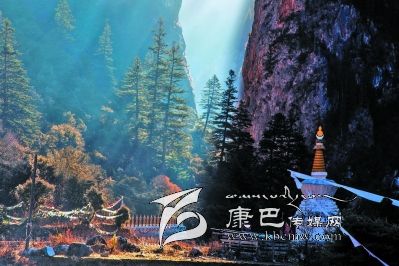 進(jìn)得溝來,卻又是另一番景致。溪水在窄細(xì)的深谷中忽隱忽現(xiàn),水聲叮咚,時而從碎石卵灘下潛淌,時而冒出雪花樣的身影,不張揚(yáng),含靦腆,與兩邊千仞峭崖的兇猛樣恰成強(qiáng)烈對比。此時容不得你不抬頭望山,望天了。極盡險峻的峭壁奇峰,危巖巨石,陰面如潑了墨暈,陽面露了慘白,硬硬地把個溝谷擠成了“一線天”,駭?shù)谜锪锏奶焐弦粌蓤F(tuán)亂云也不敢停歇片刻,欲飄走,卻又被錯落參差的山峰撕得七零八落。更有那墨黑如黛的松柏齊齊地排隊(duì)豎立在危崖峭壁間,或一兩階,或三四階,如挎刀武士護(hù)著峭崖,又如黑大漢長的亂糟糟的絡(luò)腮胡,徒增添了猙獰之貌。傳說皮察溝內(nèi)有座黑教的神山——呷拉神山,每到“朝山會”,農(nóng)牧民前去神山朝拜。然而,呷拉山頂不知何時棲居了一只碩大的“夏甲曲絨”(意為一種兇惡的鳥),不時將村里百姓的牛、羊叼到山頂吞食。藏王格薩爾得知此事,決心要除掉“夏甲曲絨”。 “夏甲曲絨”得知格薩爾王大軍前來征服它,十分懼怕,數(shù)日藏于洞中不敢出來。格薩爾王隱身于巖石背后,讓王妃珠牡設(shè)法引“夏甲曲絨”出洞。“夏甲曲絨”形體碩大,棲息的洞無法掩其全身,頭部露在外面,時時觀察動靜。珠牡到接近洞口的地方,滔滔不絕地贊譽(yù)“夏甲曲絨”長得美麗,它禁不住贊美,漸漸地伸長頭頸,最后驕傲地露出潔白的全身,并高昂著頭。格薩爾王趁機(jī)迅速張弓搭箭,一箭射中“夏甲曲絨”的頸部,血流滿山,以后這座山便變成了紅山。當(dāng)“夏甲曲絨”負(fù)痛逃至皮察溝“一線天”時已精疲力竭,便停留在山崖中。格薩爾王隨即趕到,藏于灌叢,背靠巨石用腳一蹬(至今天一巨石呈凹形,似有人蹬過),再次射中“夏甲曲絨”。“夏甲曲絨”負(fù)痛逃去,停在覺然村一巨石上做垂死掙扎時,它的爪爪在巨石一抓了無數(shù)道溝痕,后人把這個巨大石稱為“鬼抓石”……我無意去尋找“紅山”、“腳蹬石”、“鬼爪石”等,也沒想深究格薩爾除妖是否用過“美人誘惑計”,但卻在溝谷里發(fā)現(xiàn)一個與眾不同的現(xiàn)象:在一處窄小的谷地路傍,長滿了雜枝黑蔓的灌叢,灌叢上彩幡密布,鉆進(jìn)灌叢,里邊竟然塑了一尊格薩爾王的神象,神象不高大,卻威儀,的確像是藏在崖壁下灌叢中……很容易讓人想到故事中的情節(jié)。