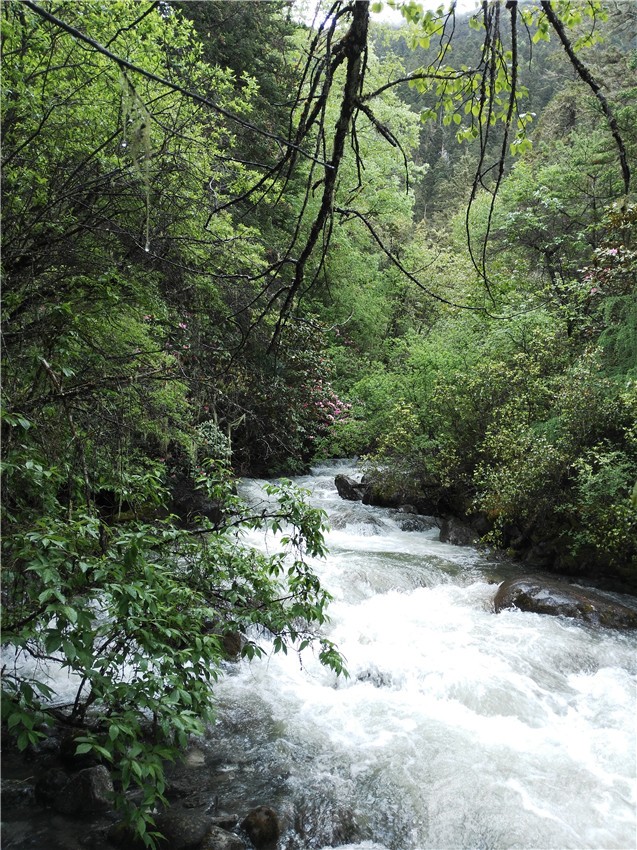 杜鵑花!又有美女的驚叫把我們的視線拉到了另一個(gè)方向,也即我們左手山坡上,一大片姹紫嫣紅的杜鵑花正灼灼綻放于郁郁蔥蔥的林木之間。而這時(shí)也就發(fā)現(xiàn)了,左手邊其實(shí)是一片花的海洋,各類(lèi)不知名的花朵競(jìng)相爭(zhēng)艷,把拉角溝初晴的時(shí)空打扮得格外妖艷。于是眾人紛紛拿出手機(jī)兼相機(jī),將這難得一見(jiàn)的景致拍攝下來(lái),而這一過(guò)程中,美女們總忘不了騷首弄姿地把自己擺進(jìn)畫(huà)面之中,雖然這些美女都是妖婆級(jí)的美女了。至于男士,多數(shù)則呵呵笑著看著,頗有閑庭信步、云卷云舒之意。