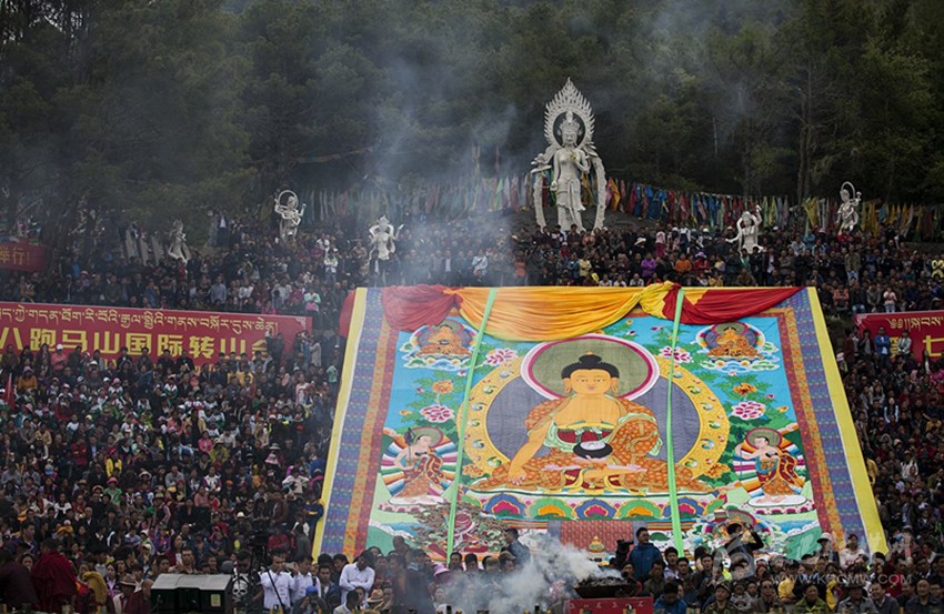 農(nóng)歷四月初八是釋迦摩尼的誕辰,這一天也是以藏傳佛教為主要信仰的康定人的重要日子。就連周邊地區(qū)的藏民也全部盛裝趕來(lái)。每逢這天,民眾自東關(guān)出、上跑馬山,寺廟的喇嘛們抬出巨幅唐卡畫卷曬佛,在法號(hào)聲聲中,眾人禮佛朝拜。在熱鬧的歌舞表演之后,再沿公主橋下,轉(zhuǎn)金剛寺、南無(wú)寺,沿阿里布果轉(zhuǎn)山步游道至子耳坡返回,轉(zhuǎn)山一圈,繞城一周,誦佛萬(wàn)變,以紀(jì)念佛祖誕辰,并祈禱吉祥安康。