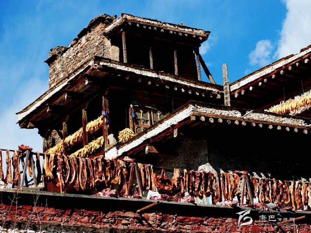 嘉絨藏族年到來之前幾天,丹巴藏寨格外耀眼美麗。寨房的主人們都依照傳統(tǒng)習(xí)俗,以當(dāng)?shù)氐?ldquo;白泥巴”為主要原料,通過配方煎制成白色染料,精心涂染寨樓墻面,并用白灰在墻面上繪畫出天、地、日、月、星和各種動物圖案和宗教圖案,使整個藏寨披上潔白的盛裝。每年冬月12日就到了嘉絨藏族年大年三十,這天,山寨家家戶戶面滿柜、酒滿壇、水滿缸、柴滿棚,歡歡喜喜過迎新年;宰殺肥豬腌制香豬腿、制作豬膘,擺上酒席、跳上鍋莊祝福新年。