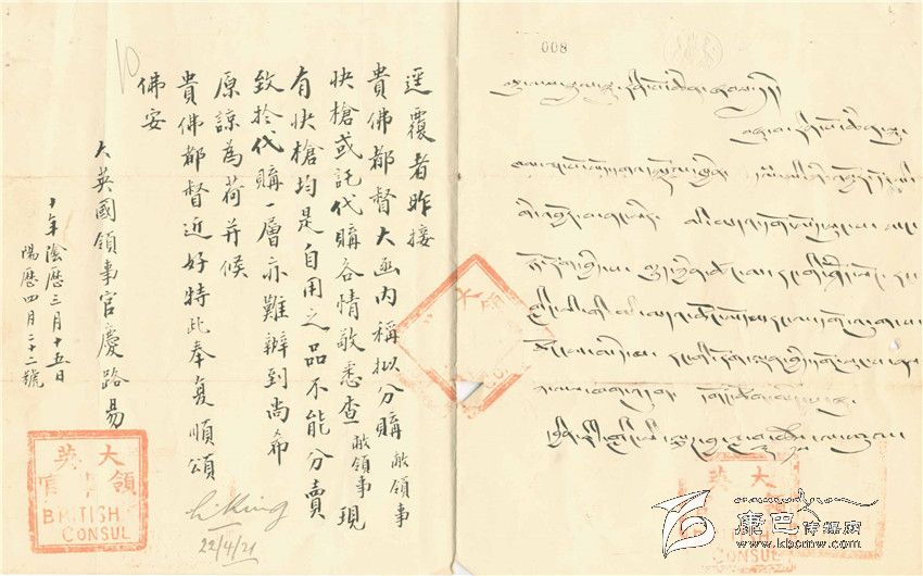 可以肯定的是,這就是給某位活佛的復(fù)信,除了稱呼佛都督(這是在當(dāng)時(shí)對(duì)活佛的通行的敬稱)可以看出外,還有藏文可以佐證。這張紙片上寫道:昨接貴佛都督大函,內(nèi)稱,擬分購敝領(lǐng)事館快槍或托代購各情敬悉。查敝領(lǐng)事現(xiàn)有快槍均是自用之品,不能分賣。致于代購一層,亦難辦到,尚希原諒為荷,并候貴佛都督近好,特此奉復(fù),順頌佛安。署名是大英國領(lǐng)事館官慶路易,日期為十年陰歷三月十五日,陽歷四月二十二日。在公章下面注有公元1922年4月22日。