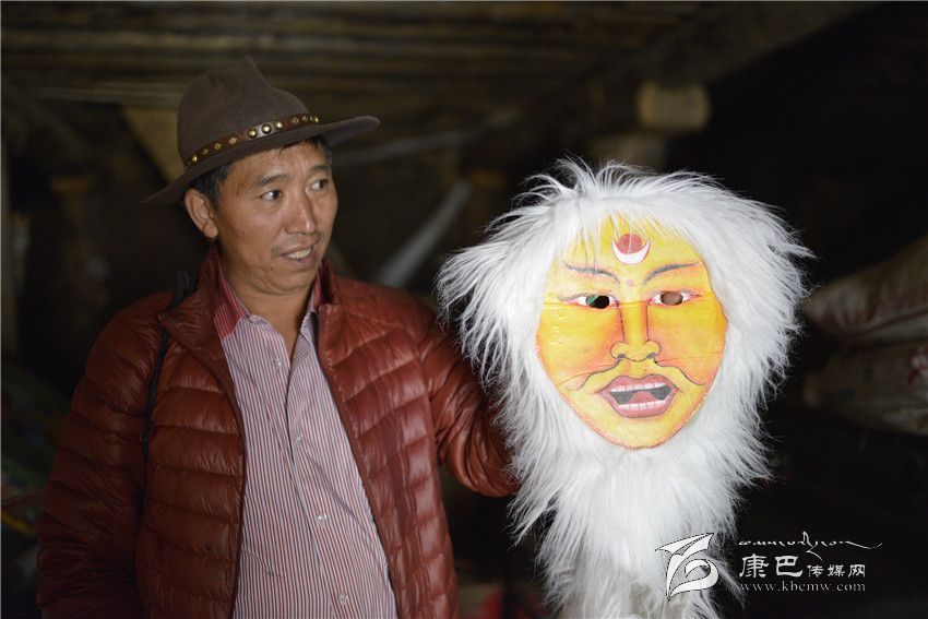 午飯后,洛絨丹巴帶我到離家不遠(yuǎn)的一個小院,推開底樓嘎吱作響的木門,借助外面的光亮,看見有幾個巨大的鐵皮箱。洛絨丹巴打開一口箱子,不想里面整齊地放著各種戲服;第二口箱子是頭飾,唐朝文成公主的、清朝皇帝的。這些服裝和頭飾多是模仿電視電影,或者加上想象自己制作的,個別是外地方買回的。最具特色是第三口箱子,用牛皮制作的各種面具、表情十分夸張,有和善的、猙獰的、威風(fēng)的,神情各異。面具的顏色各種各樣,白色、黑色、黃色、紅色等。眼睛和嘴巴處挖了窟窿,有的還在面具外圍綴了一圈羊毛。洛絨丹巴指點著各種顏色的面具介紹:白色代表純潔、紅色代表威嚴(yán)、黃色代表吉祥;巫女則半黑半白,象征其兩面三刀的性格;青面獠牙代表妖魔。說起這些他如數(shù)家珍。