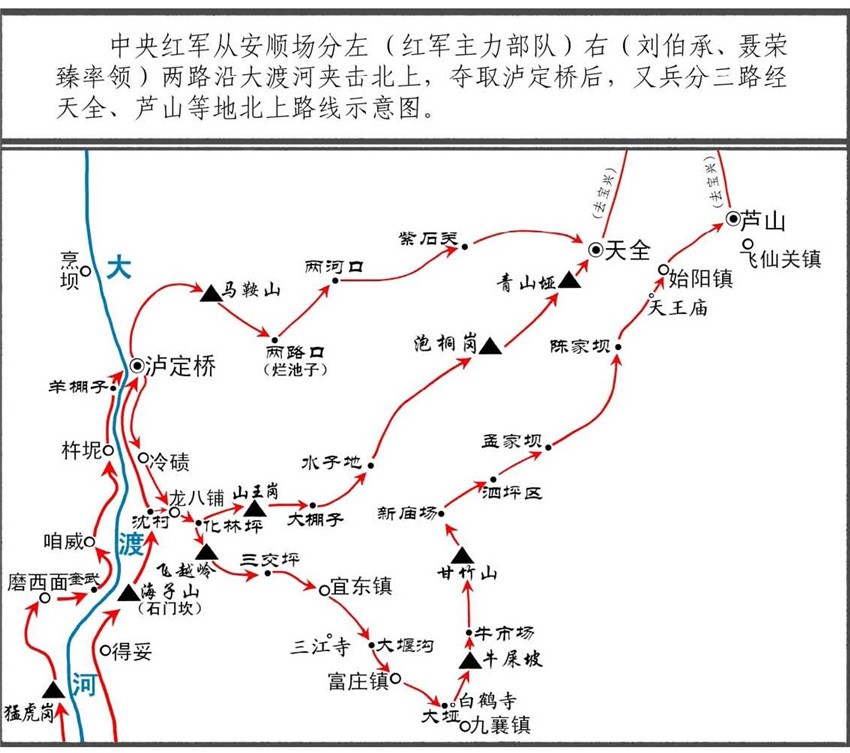 紅軍撤離瀘定行軍示意圖。