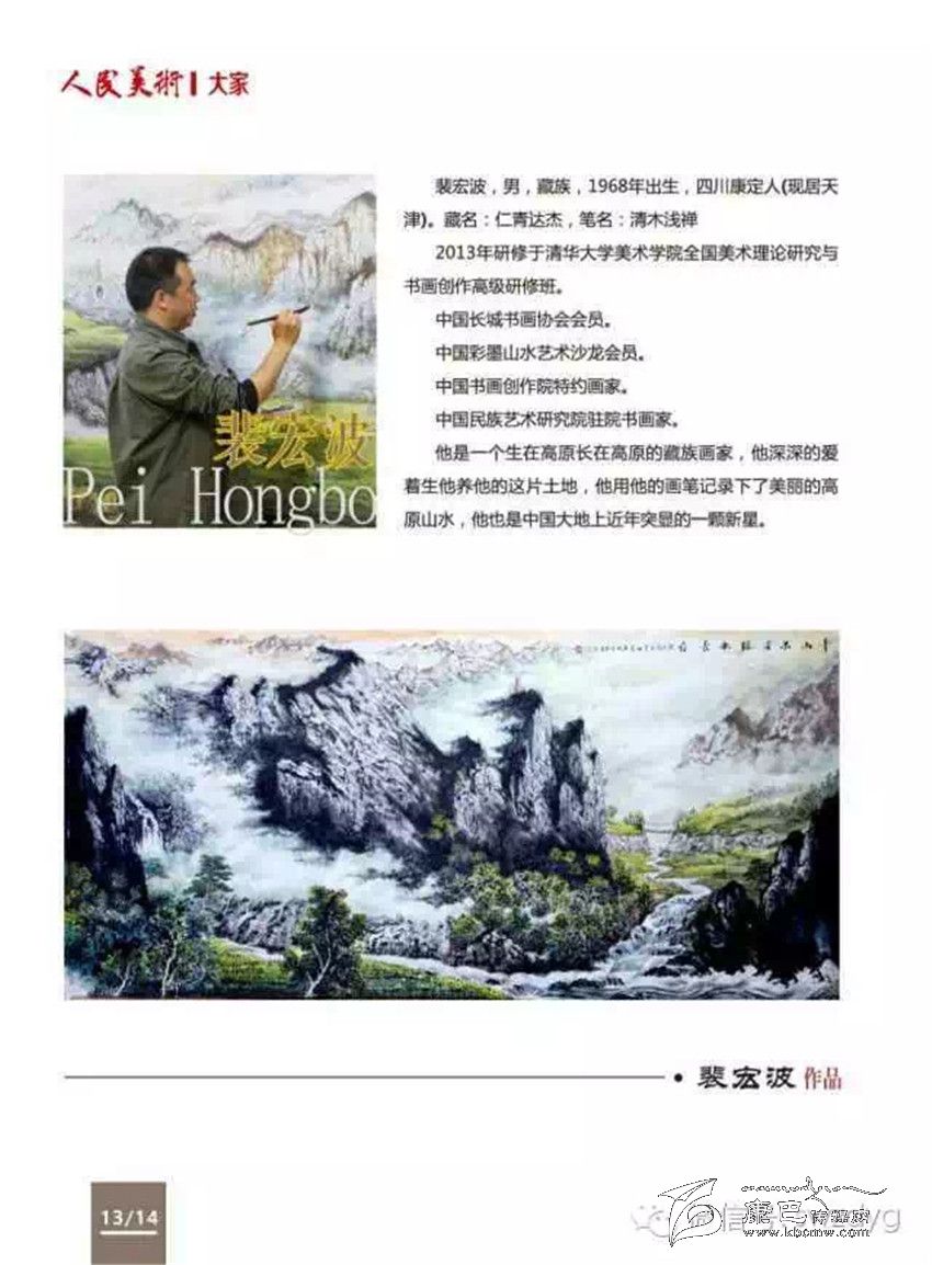 《人民美術》是中國最具權威的美術雜志、國家核心美術雜志和美術界最高學術雜志,由《人民日報》社主管。雜志社對裴宏波及其作品給予了高度評價,認為藏族畫家裴宏波的作品極具生命力,在中國美術史上又有了新的突破,富有民族性、地域性、創(chuàng)造性、歷史性,最終決定列選為中國大家。雜志中裴宏波排在劉大為、曹雕、劉文西等之后。