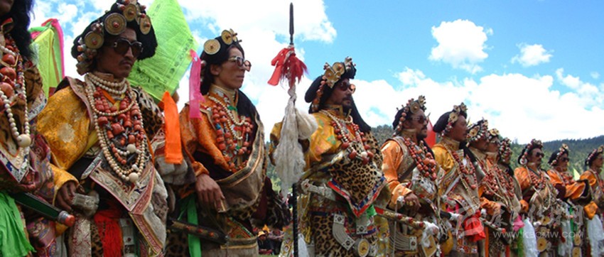 康巴牧區(qū)服飾,男女老少秋冬季均以厚重的原生皮板老羊皮、羔羊皮為袍,上飾粗獷的五色布、呢料條紋或“雍宗”、日月等圖案紋裝飾,夏裝則常以輕、薄的各色面料或自織牛羊毛呢制成的單或夾的長袍。上鑲彩虹氆氆尼花邊,康北一些農(nóng)區(qū)還時興針織栽羊毛的袍、褲、衣等。男戴寬沿白氈帽,女梳百辮,戴羊皮帽,耳、項、胸、腰、背、腕、手佩各種用金、銀、珠玉、寶石制作鑲嵌的飾品。禮儀節(jié)日盛裝選料更為華貴、精美。