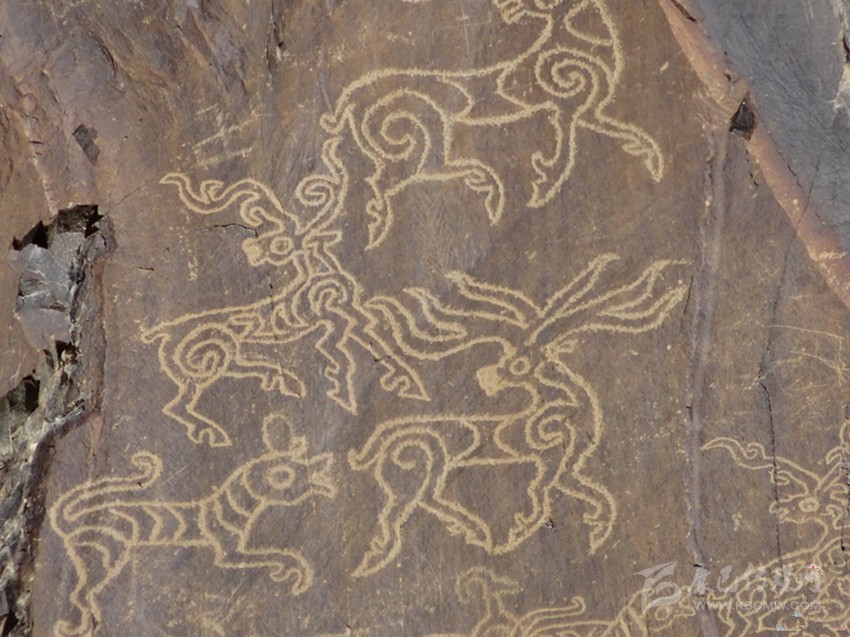 這個傳說暗合了青藏高原上的遠(yuǎn)古美術(shù),在西藏日土縣任姆棟遺址發(fā)現(xiàn)新石器時期的巖畫,就是使用堅硬材質(zhì)在巖石表面來刻畫圖像的。從這些巖畫上我們可以看出,西藏美術(shù)所具備的兩個藝術(shù)基因:一是以線造形的方式,二是裝飾性的畫風(fēng)。這兩個基因至今還在唐卡中保留著。
