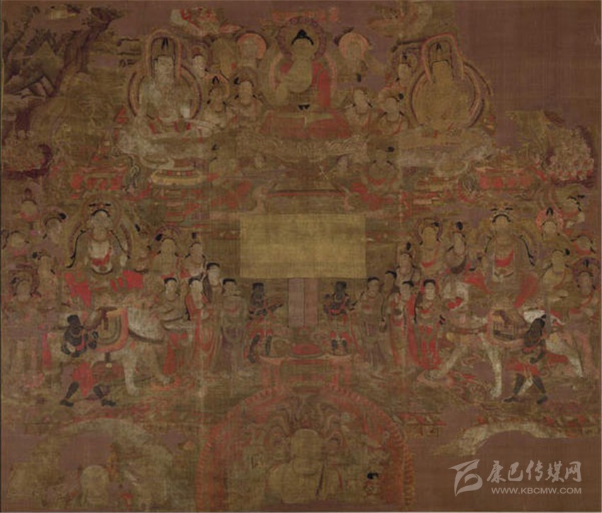 公元十三世紀(jì),印度波羅王朝覆滅。佛教中心超戒寺被毀,大量的佛教藝術(shù)家和工匠逃到了尼泊爾馬拉王朝,所以尼泊爾的藝術(shù)是從這個(gè)時(shí)期開始發(fā)展強(qiáng)大的,這相當(dāng)于是“藝術(shù)的接棒”。尼泊爾的繪畫風(fēng)格,就沒有石窟的概念了,透視立體也逐步被消解,然后用卷草等紋樣填滿背景,畫面變得平面化、精致化了。
