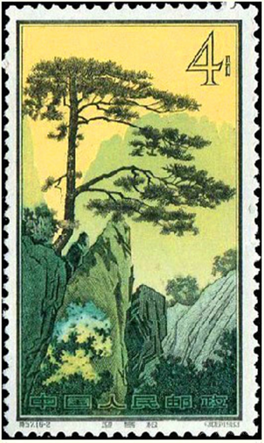 1963年發(fā)行的《黃山風(fēng)景》特種郵票(16-2)“迎客松”。