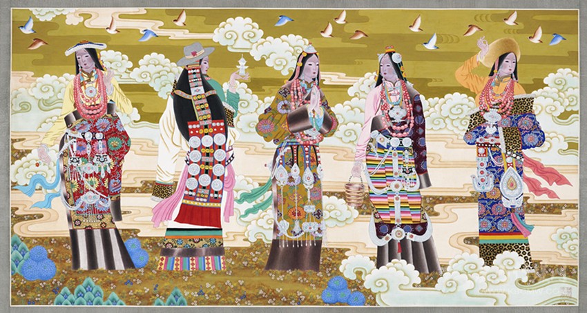 青藏高原有著曠遠(yuǎn)弘大的人文地理,有著神秘久遠(yuǎn)的宗教文化傳承,正是這蒼茫大地孕育了藏族人;正是這片極度追求審美體驗并把生活高度藝術(shù)化的疆域,滋養(yǎng)了西藏藝術(shù)。從早期的巖畫、旗幡畫、唐卡、壁畫,再到當(dāng)代的丹青重彩,無不生發(fā)于這片神奇高原,皆是中華民族文化寶庫中燦爛的牟尼寶珠。唐卡繪畫肇啟于松贊干布隆興之時,向南學(xué)習(xí)印度、尼泊爾布畫,往西受到犍陀羅藝術(shù)浸潤,向東融合唐、宋、明、清之審美,再集藏地宗教文化、民族審美熔為一爐,鑄就一千三百年唐卡繪畫之法脈。它不僅是獨具魅力的藏文化之血脈源流,更是各民族文化交融、和諧互生的典范,對世界藝術(shù)有著深遠(yuǎn)的影響。