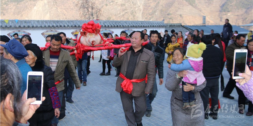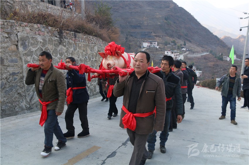 5個村民將年豬抬到秤上。360斤。村民為年豬準備大紅花。準備紙錢、香蠟。9點整,殺豬匠開始了他的工作,在眾人齊心協(xié)力下,光溜溜的年豬被打整干凈?!氨S游覀兇鍋砟觑L調雨順、五谷豐登,村民平安健康。”村中老者敬過天地后,8個身強力壯的村民站在年豬旁,豎著拇指齊聲說,今年家家戶戶還要養(yǎng)大肥豬。抬著年豬,村里的中老年人簇擁著,走在最前面,唱著悅耳的民謠,大意是歌唱幸福生活的,迎著2018年的第一縷陽光,村民們喜氣洋洋。到村里來的游客蜂擁拍照。