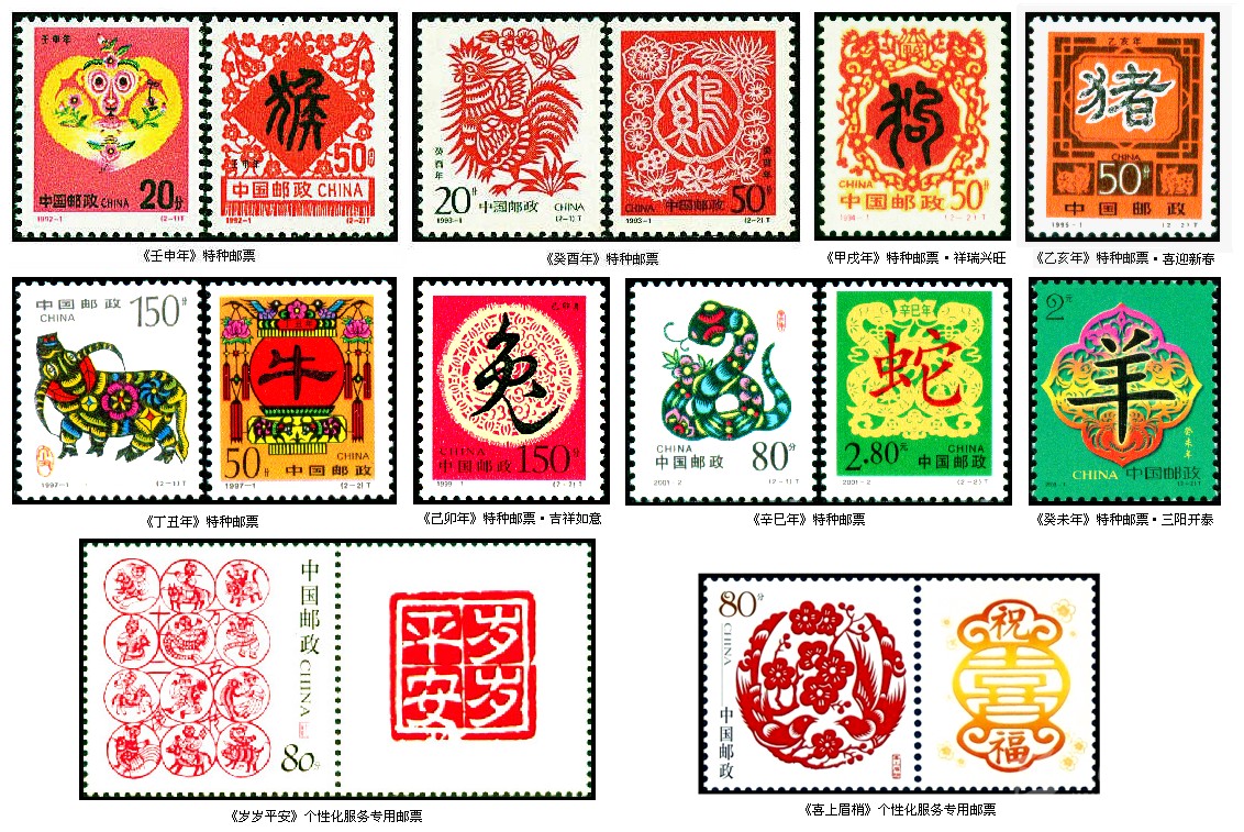 剪紙作為藝術(shù)百花園中的一朵奇葩,在我國(guó)郵票圖案設(shè)計(jì)中應(yīng)用也非常廣泛。由于傳統(tǒng)的民間剪紙有著濃郁的吉祥喜慶氣氛,因此在我國(guó)近些年發(fā)行的生肖郵票中多次出現(xiàn)剪紙藝術(shù)。在第二輪12套24枚生肖郵票中的剪紙圖案分別有1992年《壬申年》的“猴桃獻(xiàn)瑞”和“喜鵲登梅”、1993年《癸酉年》的“雄雞報(bào)曉”和“四季吉祥”、1994年《甲戌年》的第二枚“祥瑞興旺”、1995年的《乙亥年》的第二枚“喜迎新春”、1997年的《丁丑年》的“金牛奮蹄”和“牛耕年豐”、1999年《己卯年》的第二枚“吉祥如意”、 2001年《辛巳年》的“祥蛇祝福”和“祥運(yùn)普照”以及2003年的《癸未年》第二枚“三陽(yáng)開泰”等。這些郵票中剪紙圖案有的直接取材于民間,有的則是在原作基礎(chǔ)上再創(chuàng)作。如“雄雞報(bào)曉”一枚,圖案選用的是河北省獻(xiàn)縣本齋鄉(xiāng)鄧家莊蔡蘭英老人的剪紙“百雞圖”中的一幅,而“金牛奮蹄”一枚,圖案是根據(jù)山東高密民間藝人齊秀花的剪紙“媳婦騎牛”再加工創(chuàng)作而成的。在我國(guó)發(fā)行的祝福系列個(gè)性化服務(wù)專用郵票中也有吉祥喜慶的剪紙圖案,即2005年11月6日的《歲歲平安》和2005年11月11日的《喜上眉梢》等。