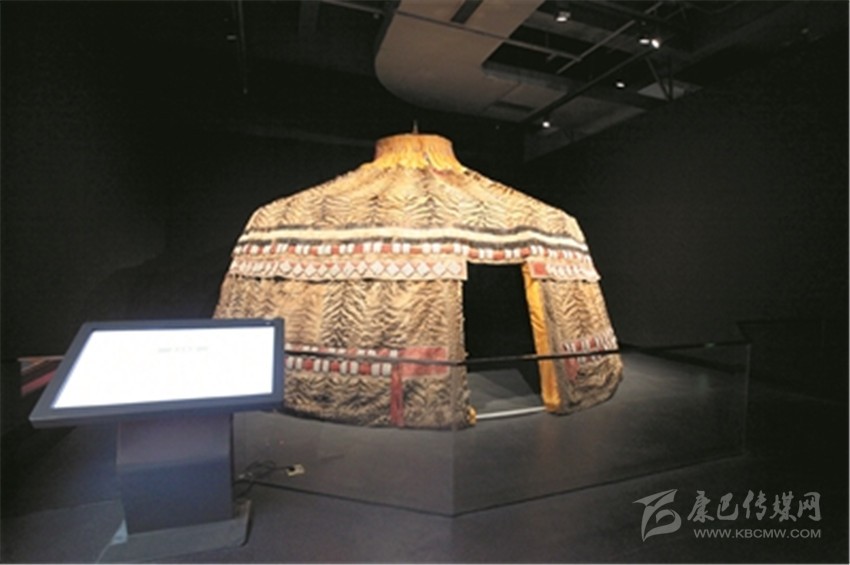 從體積上來說,“虎皮帳篷”確實是館藏文物當(dāng)中最大體量的一件物品。在眾多文物中,它的名聲在外。根據(jù)它的型制,人們測量虎皮圍度,訂制鋼架,四五個人同時搭建,才呈現(xiàn)出人們現(xiàn)在所看到的蒙古包樣式。這頂鑲海貝虎皮圓頂帳篷,共計108張虎皮。整體由二幅扇形帳頂,四幅近長方形帳圍,共六幅組成蒙古形式帳篷。其上點綴海貝作裝飾,帳主體為虎皮面料,間有豹皮、獺皮、駱駝皮等,有紅色粗棉布里襯。