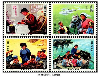 “燃燒自己,照亮別人”,是每一位教書人的精神寫照。在我國發(fā)行的郵票中就常常出現(xiàn)那些工作在基層的普通教師的忙碌身影。1959年9月25日,我國發(fā)行《人民公社》特種郵票,其中第5枚“學”,圖案是一位手執(zhí)課本神情專注地在課堂上教學的老師。這是我國郵票中首次出現(xiàn)教師形象。1966年5月10日,我國發(fā)行《服務(wù)行業(yè)中的婦女》特種郵票,其中第4枚“保育員”,是反映我國幼兒教師工作情景的一枚郵票。1976年2月20日,我國發(fā)行《勝利完成第四個五年計劃》紀念郵票,其中第13枚“牧區(qū)小學”,圖案是一位藏族女教師在寬敞明亮的教室里授課的情景,反映了新中國成立后,特別是第四個五年計劃期間,我國少數(shù)民族地區(qū)飛速發(fā)展的教育事業(yè)。1975年3月8日,我國發(fā)行《鄉(xiāng)村女教師》特種郵票,全套4枚,圖案分別是“認真看書學習”“巡回教學”“開門辦學”和“水上小學”。全套郵票是工作在廣大農(nóng)村的中小學教育工作者在辦學條件艱苦的情況下仍然堅持認真學習、勤奮工作、忠于黨的教育事業(yè)的真實寫照。