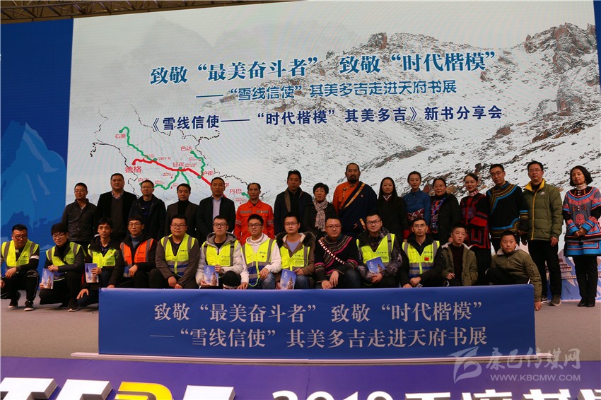 在分享會(huì)舞臺(tái)的一側(cè),靜置著書籍《雪線信使——“時(shí)代楷模”其美多吉》放大后的封面。封面上,其美多吉、藍(lán)天與雪山相得益彰,構(gòu)成了一幅獨(dú)具特色的畫面。