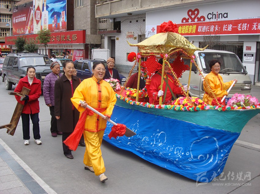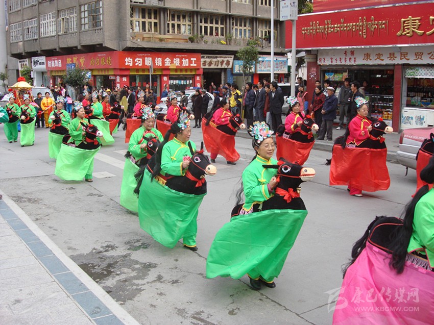半個(gè)世紀(jì)風(fēng)靡康定城的“船燈”、“馬馬燈”、“鬧山鼓”、“扭秧歌”、“笑頭和尚戲柳翠”、“霸王鞭”……整個(gè)兒就像老陜過年時(shí)的“社戲”場面。大年初一、十五夜“出燈”游街,熱鬧氣氛把整個(gè)年節(jié)塞得滿滿的。記得我孩童時(shí)見過一次“出燈”游行,不是晚上而是在大白天(叫“出游”)。寺廟喇嘛吹奏佛樂走在前面,接著是“川北”人的川劇鑼鼓;再后面跟著的就是“馬馬燈”、劉老陜的“船燈”、鐵木社的“龍燈”、二輕局的“霸王鞭”、南門上的弦子隊(duì)、三居委的腰鼓隊(duì)、北三巷的“道孚鍋莊隊(duì)”……游行隊(duì)伍遇街口寬敞地方必圍圈演出。“人老啦,人老啦,人老先從頭上老,白的多來黑的少, 開——船——羅!”“銀須飄灑”的艄公劉老陜用俏皮逗趣的陜腔告白開場詞,在歡喜鑼鼓的伴奏中“劃”著旱船出了場。旱船闖“急流”、過“險(xiǎn)灘”,風(fēng)趣又逼真;如果哪家的姑娘打扮成古裝戲里的嬌美仕女坐上旱船游了街,那她立馬就成了康定城人皆贊譽(yù)的“美女”。接著就是“馬馬燈”,幾十個(gè)“騎馬橫槍”的古裝將士馳騁上場,排兵布陣,穿梭并行,“馬”鈴聲鼓樂聲交織一起……鬧翻了康定城的“三山二水”。