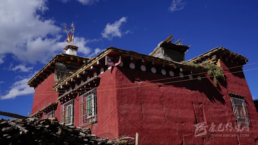 外裝飾也不繁復(fù)。外墻用磚紅色粘土調(diào)成泥漿上色,現(xiàn)在多用化學(xué)顏料。大門用一種叫“抓”的天然礦物質(zhì)涂料,這種顏料容易染色,挨一挨都會讓衣服沾上絳紅色,現(xiàn)在也用化學(xué)涂料代替。二樓與“砸口樓”檐口處裸露在外面的木頭,用漆絳紅色顏料涂抹,支出來的小圓木涂白色顏料。遠遠望去,紅白相間,錯落有致,巴塘方言藏語稱之為“東椎”。檐口頂上用排成“人”字形的小青瓦點綴,窗框和門框都涂成絳紅色,也用“東椎”與青瓦裝飾;有條件的人家安裝雕花窗棱,嫌麻煩就用普通的大格子窗。外置庭院,種花植木,一座傳統(tǒng)的紅藏房便竣工了。