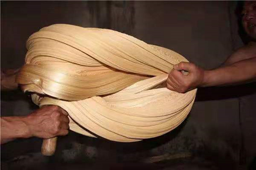 扯糖也是熬糖過程中十分關(guān)鍵的一個環(huán)節(jié)。剛出鍋的糖溫度可達兩三百度,徒手是不敢去觸碰的,扯糖需等到麻糖變得溫?zé)岵拍苓M行,但又必須在它完全冷卻之前完成整個扯糖工序,否則等麻糖徹底冷卻就會變得僵硬無比。休息少頃,只見三叔熟練的用粘著面粉的手從盛放麻糖的簸箕中扯下三四斤左右的一團麻糖,左手拿糖右手持杖(類似于搟面杖的木棍)作出扯糖的姿勢,此時四叔拿著早已準備好的沾了面粉的木棍將三叔的手中的麻糖攔腰別住,用力均勻的拉扯麻糖,三叔則在原地扎樁站穩(wěn),一手持杖作拉扯狀,一手微微扶住想要往下掉的糖尾,經(jīng)過幾次折疊和來回拉扯,麻糖變得均勻細長,兩人合力將扯好的麻糖平穩(wěn)的放在鋪有熟面粉的大簸箕中靜待冷卻。間隙二叔和父親又重復(fù)著扯糖的動作,很快將一團糖餅扯成糖帶。經(jīng)過拉扯后麻糖中間會形成很多的空洞,吃起來酥脆香甜。