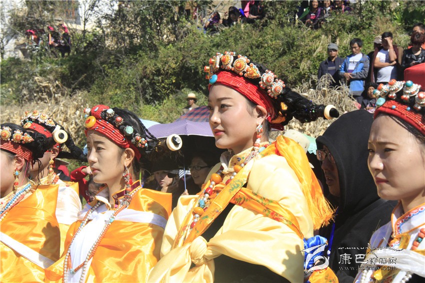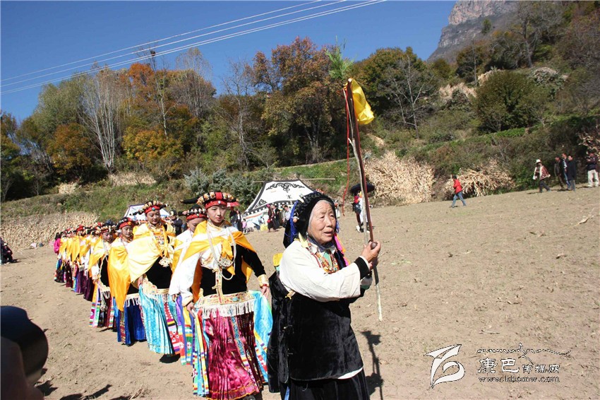 所有的祈福儀式結(jié)束后,村子里一位德高望重的長(zhǎng)輩走上圓臺(tái),用雄渾有力的嗓音向場(chǎng)地外等候的人們發(fā)出指令。在一段念詞結(jié)束之后,參加成人儀式女孩們的父親們?cè)谝晃焕先说闹敢戮従彽南驁?chǎng)地中央走來(lái),老人手舉一幅一米高的唐卡畫(huà),口中念念有詞,走在他后面的父親們一襲白色的毪衫,頭戴一頂灰色的禮帽,腳穿紅黑相間的藏靴,頸上掛著一根潔白的哈達(dá),滿臉肅然的緊隨老人之后,來(lái)到月形的臺(tái)子邊,站成一個(gè)半圓形。當(dāng)父親隊(duì)站定后,母親隊(duì)們也向場(chǎng)地中移步而來(lái),本次成人儀式的主角們?cè)谝晃焕习尩膸ьI(lǐng)下向場(chǎng)地中走來(lái),每一位女孩穿著打扮都是那么的光鮮靚麗,每一個(gè)人都顯得美麗動(dòng)人,她們披著黃色的披風(fēng),一根白色的哈達(dá)在胸前打著結(jié),五顏六色的哈達(dá)懸掛在這根哈達(dá)上,在姑娘們的后背迎風(fēng)飄飛。走到圓臺(tái)邊,小女孩們也圍成半圓,低著頭,等待著喇嘛們的念經(jīng)祈福和家人的祈福。此時(shí),兩位吉祥老人站了起來(lái),手中拿著凈瓶,走到姑娘們面前,一邊念誦經(jīng)文,一邊將手中凈瓶里的水倒在姑娘們的手心里,姑娘們則虔誠(chéng)的將這圣水輕輕的抹在自己的額頭上,寓意吉祥如意。待喇嘛主持儀式結(jié)束后,主持儀式的老人用嘉絨語(yǔ)向蒼天和墨爾多神山祈禱,希望神賜予孩子們美麗的面容和美好的心靈,從今日起,她們就可以真正的長(zhǎng)大成人了。吉祥詞念誦完后,母親們排著長(zhǎng)長(zhǎng)的隊(duì)伍緩緩來(lái)到孩子們的面前,將懸掛在胸前的哈達(dá)取下,久久的凝視著女兒的臉,眼角掛著幸福的淚水,用顫抖的聲音為女兒祈福,叮囑孩子們要孝敬父母,做一個(gè)正直善良的人,然后,才將白色的哈達(dá)掛在女兒的頸上,父親們則站在原地,看著母親們將哈達(dá)和祝福送給女兒,見(jiàn)證著女兒們的長(zhǎng)大成人。接受完父母和長(zhǎng)輩們的祝福之后,盛大的鍋莊舞會(huì)開(kāi)始了。小女孩們也跟隨著這些舞者們手牽著手走到場(chǎng)地中央,跳起歡快的鍋莊舞。擁忠大娘說(shuō),成年禮上的鍋莊舞會(huì)一般都要視參加成人禮儀式女孩們親戚多寡而定,每一名長(zhǎng)輩都會(huì)走到場(chǎng)地中牽頭,跳起舞蹈,這時(shí)候是女孩的長(zhǎng)輩們炫耀舞技和歌聲的時(shí)候,他們矯健的舞步和甜美的歌喉迎來(lái)眾人的和鳴。