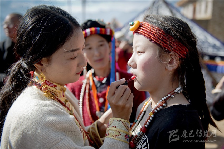 盤好發(fā)髻,佩戴好頭飾,在肩、背系好五彩哈達后,由本村具有威望的女性長者引領(lǐng)來到儀式現(xiàn)場。法號聲中,煨桑的青煙裊裊升起,威嚴的活佛主持誦經(jīng)祈福儀式。隨后,德高望重的長者為參加儀式的女子送祝福茶,長輩為姑娘們獻哈達。一系列儀式結(jié)束后,無論男女老少,都來到場地中央,踏歌起舞,跳起吉祥的鍋莊。