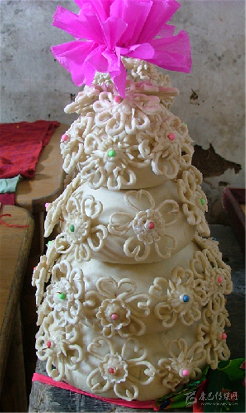何謂“花饃饃”,顧名思義,就是用面粉做成的一種夾心并模印圖案的薄餅。一般“花饃饃”的厚度約一指厚,直徑為13厘米左右。制作“花饃饃”時,一定要用新打出的本地面粉(用新面意為喜慶豐收)并不加發(fā)酵的老面(主要防止饃饃以及饃饃上的圖案變形),只加少許蘇打以水揉面即可。餡兒是由藏族特有的食品酥油、糌粑、奶渣等拌上紅糖或白糖而成。先將揉好的面粉揉成巴掌大的面坨,把調(diào)好的心子包在面坨內(nèi),然后壓平,盡量使它變成圓形,并在“花饃饃”的最中心粘一小片青綠的蘿卜葉,然后用雕有各種圖案的印板印上圖案。印板圖案多為三條圓圈或藏族美術中常有的萬吉祥等,圈內(nèi)雕有玉兔、鹿子、獐子吉祥物等,一般是一對玉兔相對而立,或是鹿子休閑躺于青草之上,或是兩朵鮮花對開,或是……再用手將“花饃饃”的周邊勒成各種花邊,并點上幾點食用紅點(紅點表喜慶,如年內(nèi)曾遇喪事則不點紅點)。最后將成形的“花饃饃”置于平鍋底在火上烘成即可。烘好后的“花饃饃”外形呈圓形,象征圓月,“圓月”里有玉兔等吉祥圖,有象征喜慶吉祥的紅,有象征春天的綠,極為鮮麗好看而又香甜味美,叫人垂涎。但做好后不能立即實用,首先要選兩個最大最好的來敬月亮,敬菩薩,要等敬月亮,敬菩薩后,中秋這天才能吃,并伴以水果等物贈送鄰里、親朋。據(jù)說這是為了促進友誼,讓大家品嘗共享吉祥。