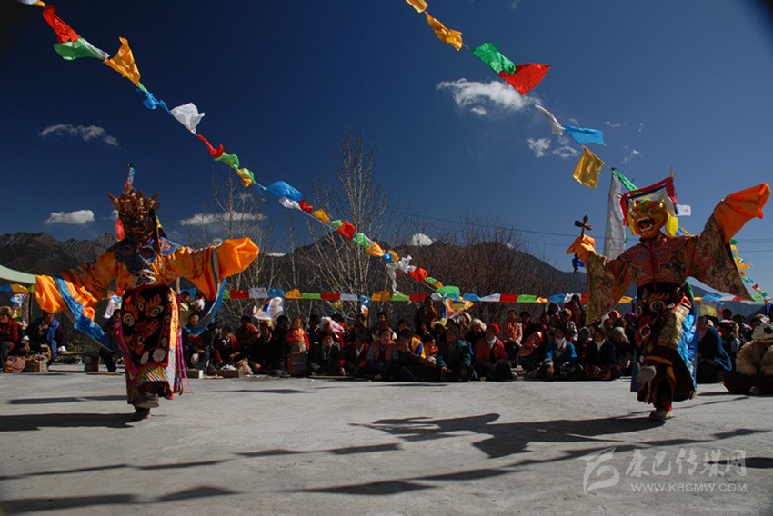 康巴藏傳佛教各派每年冬春都要舉行面具不同、內(nèi)容各異的跳神祭祀活動(dòng),規(guī)模最大的數(shù)德格縣更慶寺的普巴多吉——《金剛撅童子》跳神。這一活動(dòng)于藏歷每年元月中旬舉行,由僧人演出,連續(xù)兩天,是歷時(shí)十天的佛事活動(dòng)的組成部分。屆時(shí)群眾從四面八方絡(luò)繹而至,上萬(wàn)人匯聚于大壩爭(zhēng)相觀看,場(chǎng)面十分壯觀。