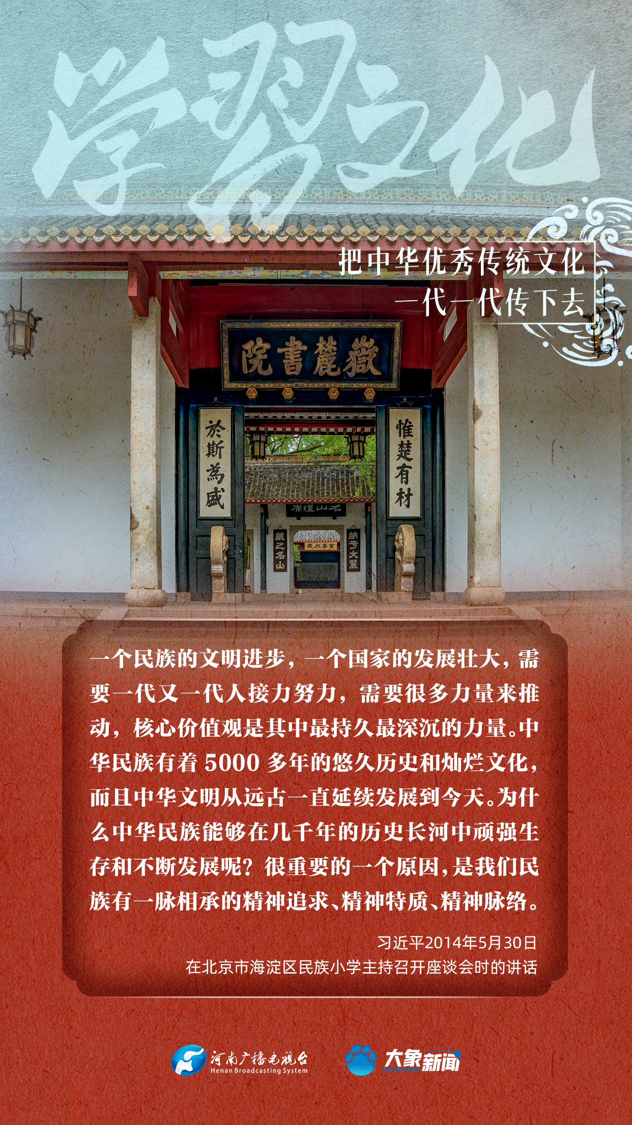 習(xí)近平總書記高度重視中華優(yōu)秀傳統(tǒng)文化的傳承發(fā)展,發(fā)表了一系列重要講話,大象新聞邀您一起學(xué)思踐悟,身體力行。