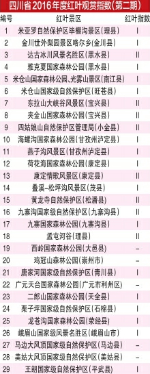 整個紅葉觀賞季期間,由省林業(yè)廳、省旅游局指導(dǎo),省生態(tài)旅游協(xié)會監(jiān)測的紅葉觀賞指數(shù)將持續(xù)發(fā)布。每周四,華西都市報(bào)將每周發(fā)布一期“紅葉指數(shù)”。在10月19日四川省林業(yè)廳發(fā)布的第二期紅葉觀賞指數(shù)中可以看到,理縣孟屯河谷、達(dá)古冰川、四姑娘山、九寨黃龍等9個點(diǎn)位都達(dá)到Ⅱ級紅葉觀賞指數(shù)。較之上周,更多點(diǎn)位的葉子開始進(jìn)入適宜觀賞期。紅葉巔峰期近在眼前。