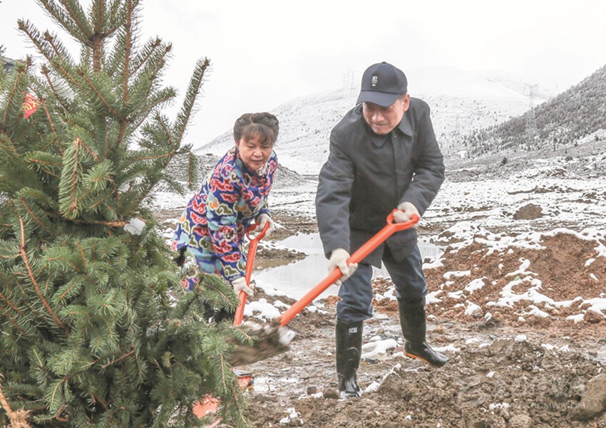 在海拔3800米的呷巴鄉(xiāng)植樹點,劉成鳴、向秋、包建華與其他州領(lǐng)導一道拿起鐵鍬與機關(guān)干部、部隊官兵和學生們一起植樹。挖坑、扶苗、填土、澆水……大家合力栽下楊柳、高山柳等一棵棵適合當?shù)厣L的樹苗。植樹過程中,劉成鳴還不時詢問本次義務(wù)植樹活動的栽種面積、樹木品種及成活率等情況。在與同學們一起植樹時,劉成鳴勉勵同學們從小樹立保護環(huán)境、愛綠護綠意識,多做有意義的事,用勤勞的雙手建設(shè)美好家園,要像今天種下的一棵棵樹苗一樣,健康茁壯成長。