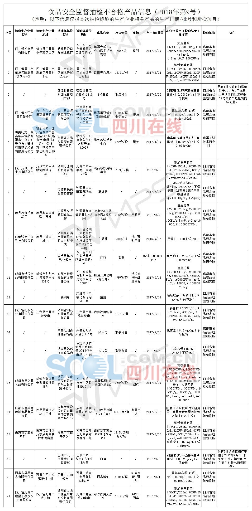 省食品藥品監(jiān)管局相關負責人表示,對上述監(jiān)督抽檢中發(fā)現(xiàn)的不合格產(chǎn)品,生產(chǎn)經(jīng)營者所在地食品藥品監(jiān)管部門已按相關規(guī)定開展核查處置,責令違法生產(chǎn)經(jīng)營者下架、召回不合格產(chǎn)品,徹查問題原因并全面整改,并責令成都、自貢、攀枝花、綿陽、遂寧、內(nèi)江、樂山、南充、廣安、達州、雅安、眉山、資陽、甘孜、涼山市(州)食品藥品監(jiān)管部門應在2018年5月22日前向省食品藥品監(jiān)督管理局報告核查處置情況并向社會公布。