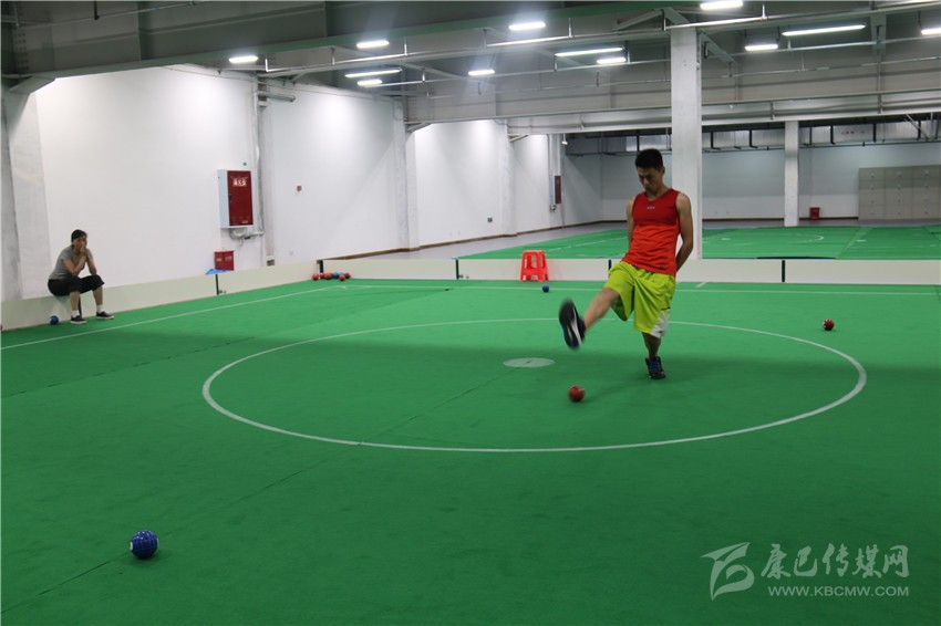記者隨后被工作人員帶到了蹴球訓練場地,只見在一個10米×10米的正方形平地上,一個運動員腳跟著地,用腳掌擠壓球,去擊中場內(nèi)球。