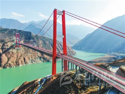 而在瀘定大渡河特大橋康定岸約200米處的公路堡坎上,寫著毛澤東主席的《七律·長征》一詩。一句“大渡橋橫鐵索寒”道出了大渡河的艱險,而如今,在這波濤洶涌的大河上,建起了如此雄偉的大橋,解決了出行難題,帶來了福祉,將促進藏區(qū)經(jīng)濟社會發(fā)展,真是讓“高原人民盡開顏”。