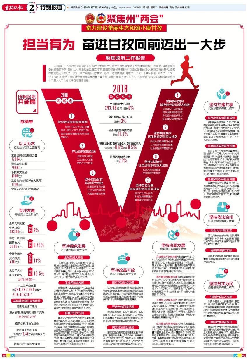 肖友才指出,今年發(fā)展形勢(shì)更加復(fù)雜、發(fā)展任務(wù)更加繁重,我們必須緊緊抓住大有可為的重要戰(zhàn)略機(jī)遇期和政策紅利“窗口期”,統(tǒng)籌兼顧、突出重點(diǎn)、突破難點(diǎn),全力保持經(jīng)濟(jì)社會(huì)高速度與高質(zhì)量并重發(fā)展良好態(tài)勢(shì),重點(diǎn)做好以下工作:一是強(qiáng)力抓好經(jīng)濟(jì)發(fā)展,推動(dòng)綜合實(shí)力大跨越。堅(jiān)持把項(xiàng)目投資作為推動(dòng)高質(zhì)量發(fā)展的重中之重,全力確保完成全社會(huì)固定資產(chǎn)投資460億元以上、地區(qū)生產(chǎn)總值突破“三百億”大關(guān);深化商貿(mào)流通領(lǐng)域改革,強(qiáng)力拓展消費(fèi)市場(chǎng),健全“圣潔甘孜”產(chǎn)品質(zhì)量標(biāo)準(zhǔn)體系,實(shí)現(xiàn)社會(huì)消費(fèi)品零售總額112億元以上;堅(jiān)定不移支持民營(yíng)經(jīng)濟(jì)發(fā)展,力爭(zhēng)民營(yíng)經(jīng)濟(jì)市場(chǎng)主體突破6萬(wàn)戶、民營(yíng)企業(yè)突破8000戶,民營(yíng)經(jīng)濟(jì)增加值占GDP比重達(dá)到48%以上;堅(jiān)持以供給側(cè)結(jié)構(gòu)性改革為主線,強(qiáng)力推動(dòng)各項(xiàng)改革任務(wù)落地見效。二是強(qiáng)力抓好全域旅游,推動(dòng)旅游經(jīng)濟(jì)大繁榮。堅(jiān)定不移實(shí)施產(chǎn)業(yè)富民戰(zhàn)略,全力推進(jìn)以全域旅游為核心的生態(tài)優(yōu)先、綠色發(fā)展,強(qiáng)力構(gòu)建“三環(huán)一帶兩濕地”發(fā)展格局,全力打造世界重要旅游目的地和國(guó)家全域旅游示范區(qū);堅(jiān)持把建設(shè)國(guó)際生態(tài)文化旅游目的地作為重要工作,全力打響中國(guó)最美雪山、中國(guó)最美濕地、中國(guó)最美草原、中國(guó)最美藏寨、中國(guó)最美漢子“五張名片”,強(qiáng)力培育生態(tài)文化旅游品牌。三是強(qiáng)力抓好工業(yè)強(qiáng)州,推動(dòng)特色產(chǎn)業(yè)大發(fā)展。堅(jiān)定不移實(shí)施工業(yè)強(qiáng)州戰(zhàn)略,堅(jiān)持“優(yōu)先發(fā)展新興產(chǎn)業(yè)、大力發(fā)展農(nóng)特加工產(chǎn)業(yè)、有序發(fā)展電礦產(chǎn)業(yè),大建園區(qū)、建大園區(qū),大建基地、建大基地,大建產(chǎn)業(yè)、建大產(chǎn)業(yè)”思路,強(qiáng)力推進(jìn)產(chǎn)業(yè)向園區(qū)集中;堅(jiān)持以建設(shè)國(guó)家級(jí)清潔能源基地為統(tǒng)攬,積極穩(wěn)妥開發(fā)礦產(chǎn)資源,積極發(fā)展戰(zhàn)略性新興產(chǎn)業(yè),強(qiáng)力推進(jìn)電礦向高端集群;堅(jiān)持以建設(shè)現(xiàn)代高原特色農(nóng)牧業(yè)基地為重點(diǎn),深入推進(jìn)農(nóng)業(yè)供給側(cè)結(jié)構(gòu)性改革,強(qiáng)力推進(jìn)龍頭向基地集聚。四是強(qiáng)力抓好統(tǒng)籌協(xié)調(diào),推動(dòng)城鄉(xiāng)面貌大提升。堅(jiān)定不移實(shí)施城鄉(xiāng)提升戰(zhàn)略,堅(jiān)持“七管齊下”“四態(tài)合一”的思路,做強(qiáng)縣城、做優(yōu)鄉(xiāng)鎮(zhèn)、做美村寨,全面推進(jìn)城鄉(xiāng)建設(shè)提檔升級(jí);堅(jiān)定不移實(shí)施鄉(xiāng)村振興戰(zhàn)略,編制完成全州鄉(xiāng)村振興戰(zhàn)略規(guī)劃和18個(gè)縣(市)鄉(xiāng)村振興規(guī)劃,全面推進(jìn)鄉(xiāng)村振興試點(diǎn)示范;堅(jiān)定不移實(shí)施交通先行戰(zhàn)略,強(qiáng)力打好第四輪“交通大會(huì)戰(zhàn)”,全面推進(jìn)區(qū)域綜合交通樞紐;高標(biāo)準(zhǔn)編制災(zāi)后重建實(shí)施方案和項(xiàng)目清單,強(qiáng)力推進(jìn)金沙江白格堰塞湖災(zāi)后恢復(fù)重建。五是強(qiáng)力抓好脫貧攻堅(jiān),推動(dòng)民生民利大保障。堅(jiān)定不移實(shí)施扶貧攻堅(jiān)戰(zhàn)略,堅(jiān)持把脫貧攻堅(jiān)作為最大的政治責(zé)任、最大的民生工程、最大的發(fā)展機(jī)遇,決戰(zhàn)決勝脫貧攻堅(jiān);深入實(shí)施教學(xué)質(zhì)量提升工程,深化醫(yī)療衛(wèi)生體制改革,完善公共文化服務(wù)體系,全力辦好社會(huì)事業(yè);堅(jiān)持就業(yè)優(yōu)先,大規(guī)模開展職業(yè)技能培訓(xùn),全面實(shí)施全民參保計(jì)劃,依法保障退役軍人合法權(quán)益,持續(xù)推進(jìn)城鎮(zhèn)棚戶區(qū)改造,全力做好水電移民安置工作,筑牢社會(huì)保障體系;堅(jiān)定不移實(shí)施生態(tài)文明建設(shè)戰(zhàn)略,嚴(yán)格落實(shí)“三線一單”制度,強(qiáng)力推進(jìn)國(guó)家生態(tài)文明建設(shè)示范區(qū)創(chuàng)建,提升生態(tài)民生福祉。六是強(qiáng)力抓好依法治理,推動(dòng)社會(huì)局面大和諧。堅(jiān)定不移實(shí)施依法治州戰(zhàn)略,深化“三區(qū)”維穩(wěn)體系和依法常態(tài)化治理,深入開展反分裂斗爭(zhēng),建設(shè)更高質(zhì)量的平安甘孜;堅(jiān)定不移把社會(huì)管理納入法治化軌道,鞏固更加和諧的民族宗教關(guān)系;堅(jiān)定不移落實(shí)安全生產(chǎn)“黨政同責(zé)、一崗雙責(zé)、齊抓共管、失職追責(zé)”責(zé)任制,構(gòu)建更大密度的安全監(jiān)管網(wǎng)絡(luò)。七是強(qiáng)力抓好自身建設(shè),推動(dòng)政務(wù)服務(wù)大優(yōu)化。堅(jiān)持依憲施政、依法治政,自覺運(yùn)用法治思維和法治方式推進(jìn)政府工作,堅(jiān)決讓公平和正義成為常態(tài);完成新一輪政府機(jī)構(gòu)改