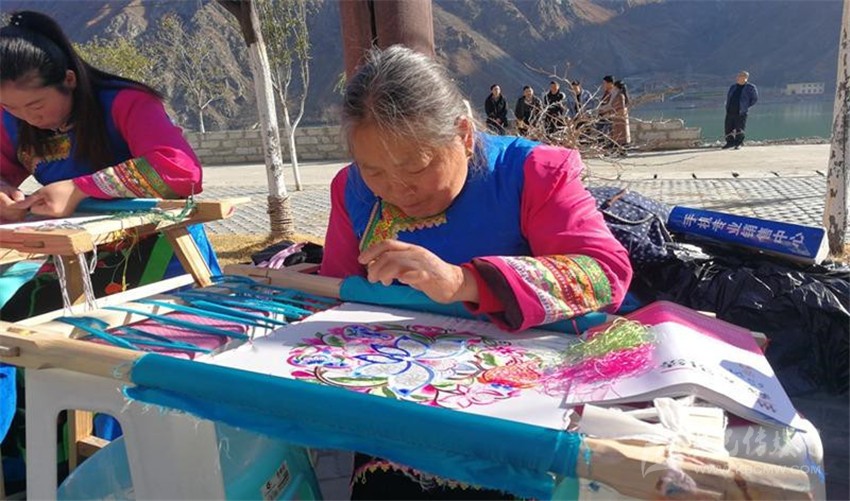 3月18日,在甘孜藏族自治州瀘定縣烹壩鎮(zhèn)沙灣村,記者見到十幾名“藏繡繡娘”圍坐在大渡河邊,飛針走線間,一幅栩栩如生、惟妙惟肖的圖案躍然布面。
