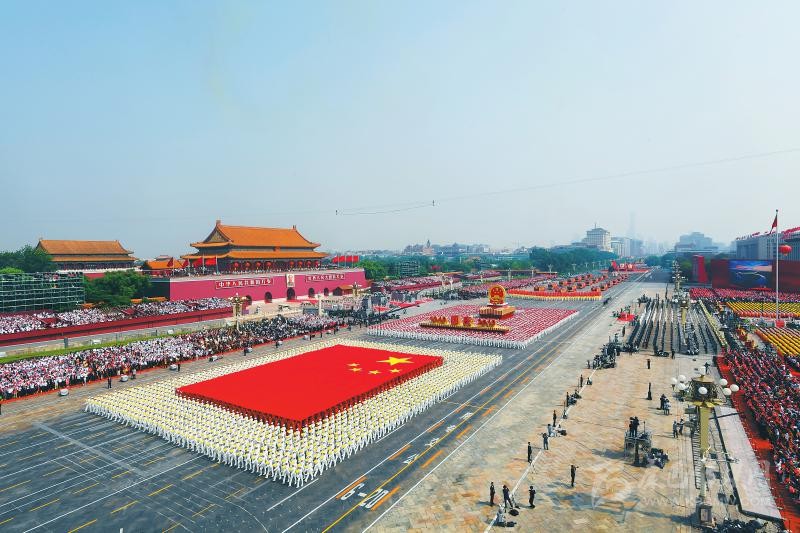 金秋時節(jié)的北京,張燈結(jié)彩,繁花似錦,處處洋溢著節(jié)日的喜慶氣氛。從天安門廣場到金水橋南端,大型“紅飄帶”主題景觀、7棵特效光影“煙花樹”、LED巨幅網(wǎng)幕、3000多名手持“光影屏”的聯(lián)歡群眾以及各族各界群眾,將聯(lián)歡活動核心區(qū)域裝扮得流光溢彩、絢麗奪目。10個群眾聯(lián)歡區(qū)分布長安街沿線,數(shù)萬群眾以歡歌熱舞,點(diǎn)贊共和國、謳歌新時代。