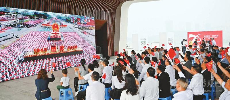 上午10時(shí),慶祝中華人民共和國成立70周年大會(huì)開始。通過電視信號(hào),大會(huì)盛況傳遞至每個(gè)現(xiàn)場?!芭c祖國母親同在,祝福祖國繁榮昌盛?!边@是大家共同的心聲?!醣緢?bào)記者 林凌 何勤華 程文雯 徐中成 陳碧紅 文莎