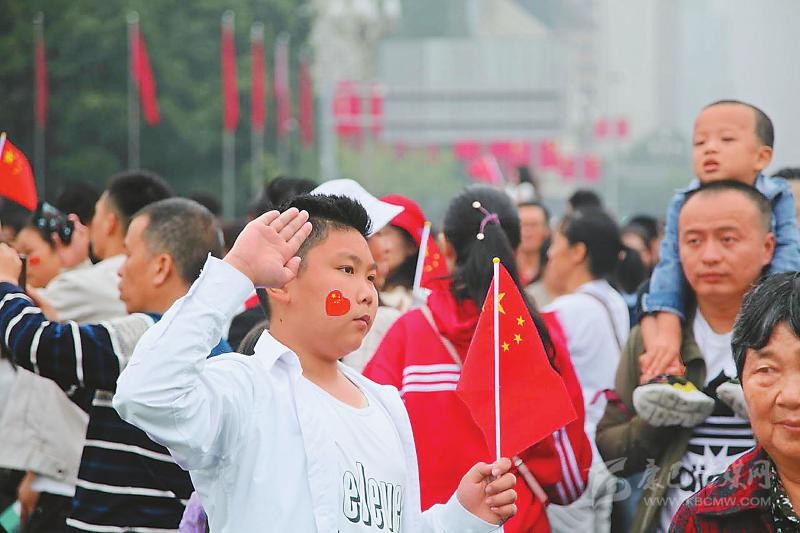 在內(nèi)江市大洲廣場,許多市民臉上貼著國旗,歡欣地?fù)]動(dòng)著手中的五星紅旗。當(dāng)慷慨激昂的國歌響起,全場人員唱起國歌,對(duì)偉大祖國致以無限敬意和深深祝福。