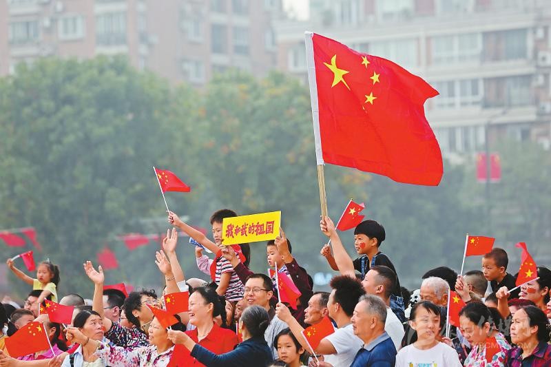 當(dāng)天,博愛新村飯店老板楊云剛特地準(zhǔn)備了一個(gè)大蛋糕,上面寫著“祝福新中國生日快樂”。當(dāng)莊嚴(yán)的國歌聲響起,早已守候在博愛新村飯店的人們跟著站起來,揮舞國旗,唱起了國歌?!翱吹酵涞能婈?duì)特別激動(dòng)!”楊云剛說。