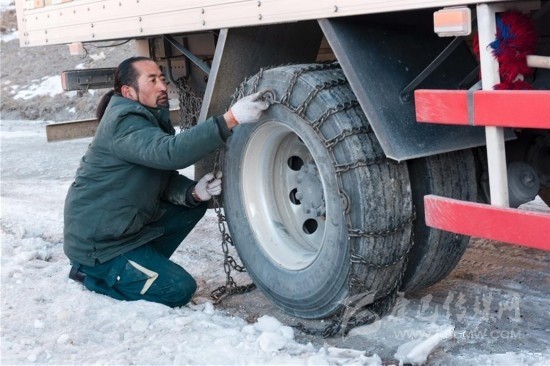 其美多吉在途中幫助社會(huì)車(chē)輛安裝防滑鏈(資料照片)。其美多吉是中國(guó)郵政甘孜縣分公司郵運(yùn)駕駛組的一名郵車(chē)司機(jī),往返在甘孜縣與德格縣之間。這段路程是四川省甘孜州綿延5866公里、平均海拔超過(guò)3500米的雪線(xiàn)郵路最危險(xiǎn)的一段。新華社發(fā)(周兵 攝)