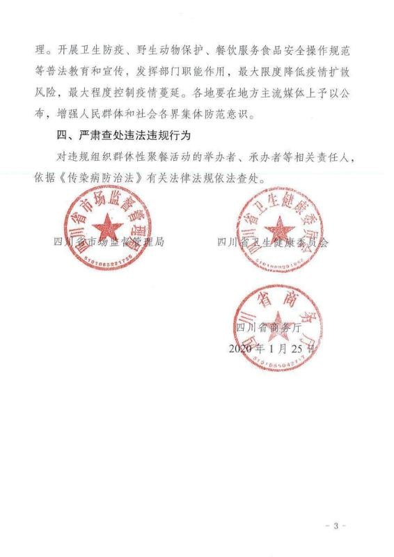 四川新聞網(wǎng)成都1月25日訊(記者 李丹)1月25日,四川省市場監(jiān)督管理局、四川省衛(wèi)生健康委員會、四川省商務(wù)廳3部門聯(lián)合發(fā)布緊急通知,近期新型冠狀病毒感染的肺炎疫情防控形勢嚴峻,為認真貫徹落實省委省政府關(guān)于啟動重大突發(fā)公共衛(wèi)生事件一級響應(yīng)措施暨應(yīng)對新型冠狀病毒感染的肺炎疫情決策部署,有效保證廣大群眾生命安全,根據(jù)《傳染病防治法》等有關(guān)法律法規(guī),禁止任何餐飲單位和個人舉辦任何形式的群體性聚餐活動,已經(jīng)訂餐的應(yīng)盡快取消或延期舉辦。