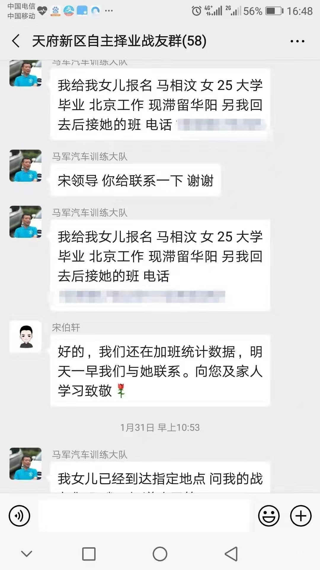 “我給我女兒報名,馬相汶,女,25歲,大學畢業(yè),北京工作,現(xiàn)滯留成都,另我回去后接她的班?!苯眨粭l微信截圖傳遍了天府新區(qū)退役軍人的朋友圈。