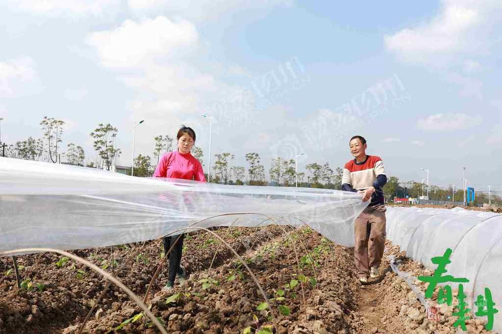 閬中市彭城鎮(zhèn)五谷臺村,村民在精心管護(hù)蔬菜,把菜苗從薄膜里“掏出來”。