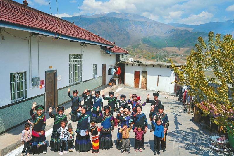 越西縣鐵西鄉(xiāng)阿支吾村,村民們在貧困戶馬海大爾(右一)新居前合影。