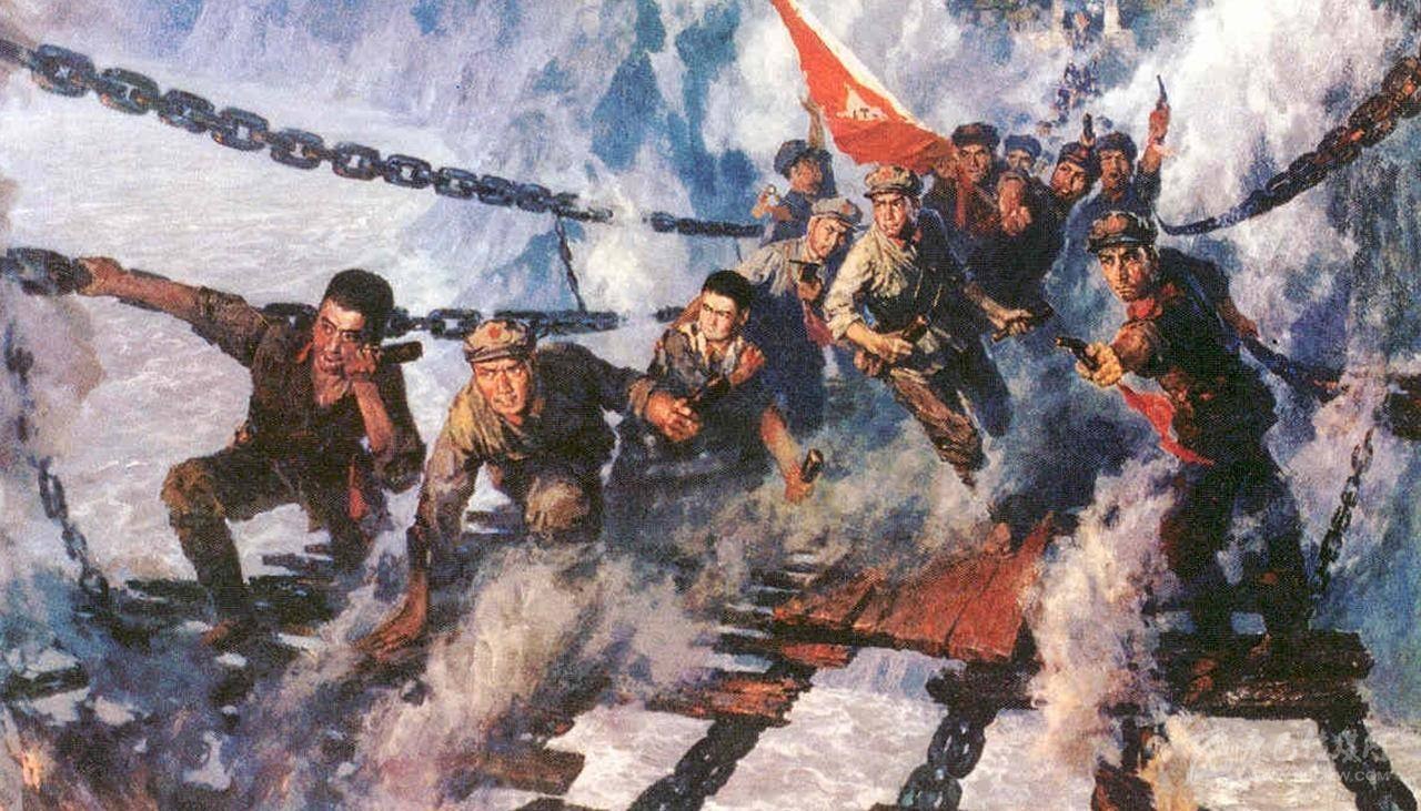 “金沙水拍云崖暖,大渡橋橫鐵索寒?!?5年前,在前有大渡河天險(xiǎn)、后有國(guó)民黨追兵的危急時(shí)刻,22位勇士臨危受命組成突擊隊(duì),冒著迎面射來的彈雨,以強(qiáng)攻手段飛奪瀘定橋,打通了紅軍北上的道路。
