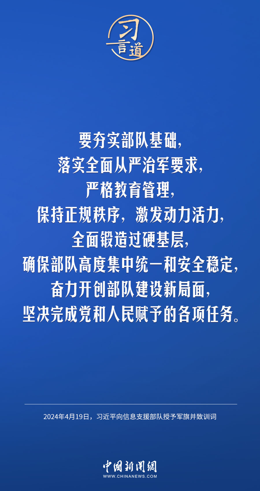 中國人民解放軍信息支援部隊成立大會19日在北京八一大樓隆重舉行。中共中央總書記、國家主席、中央軍委主席習近平向信息支援部隊授予軍旗并致訓詞,代表黨中央和中央軍委向信息支援部隊全體官兵致以熱烈祝賀。他強調(diào)——
